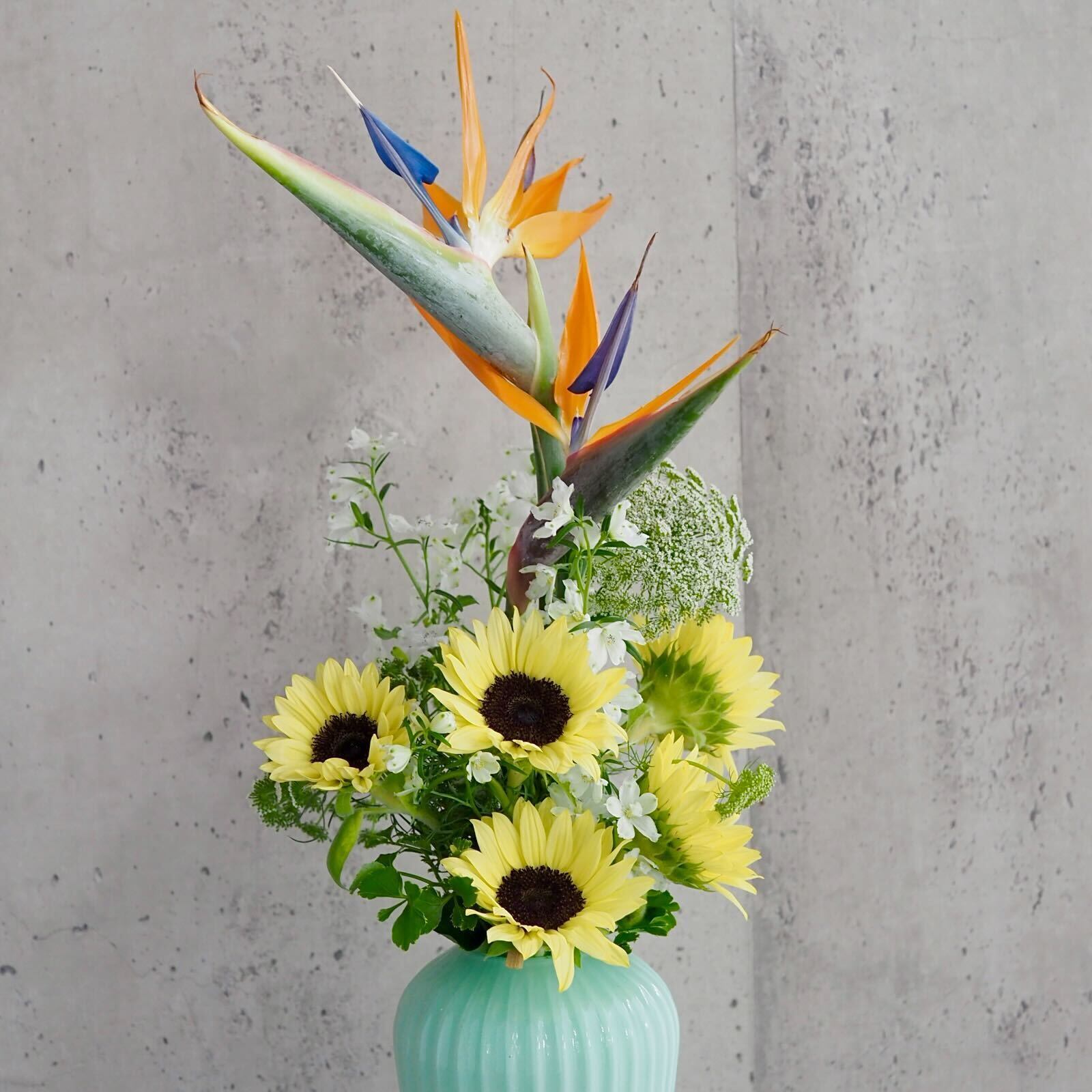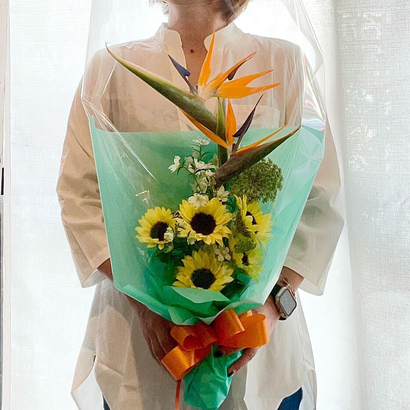 「櫻井翔の幸せごぜん」(8月10日BSフジで放送)の番組内で、櫻井翔さんが大田市場でセレクトされたものと同じ花材を使ったブーケです。お花は壁の前など飾って楽しめるワンサイドタイプの仕様です(お花は三方見で、背面にお花は入っていません)