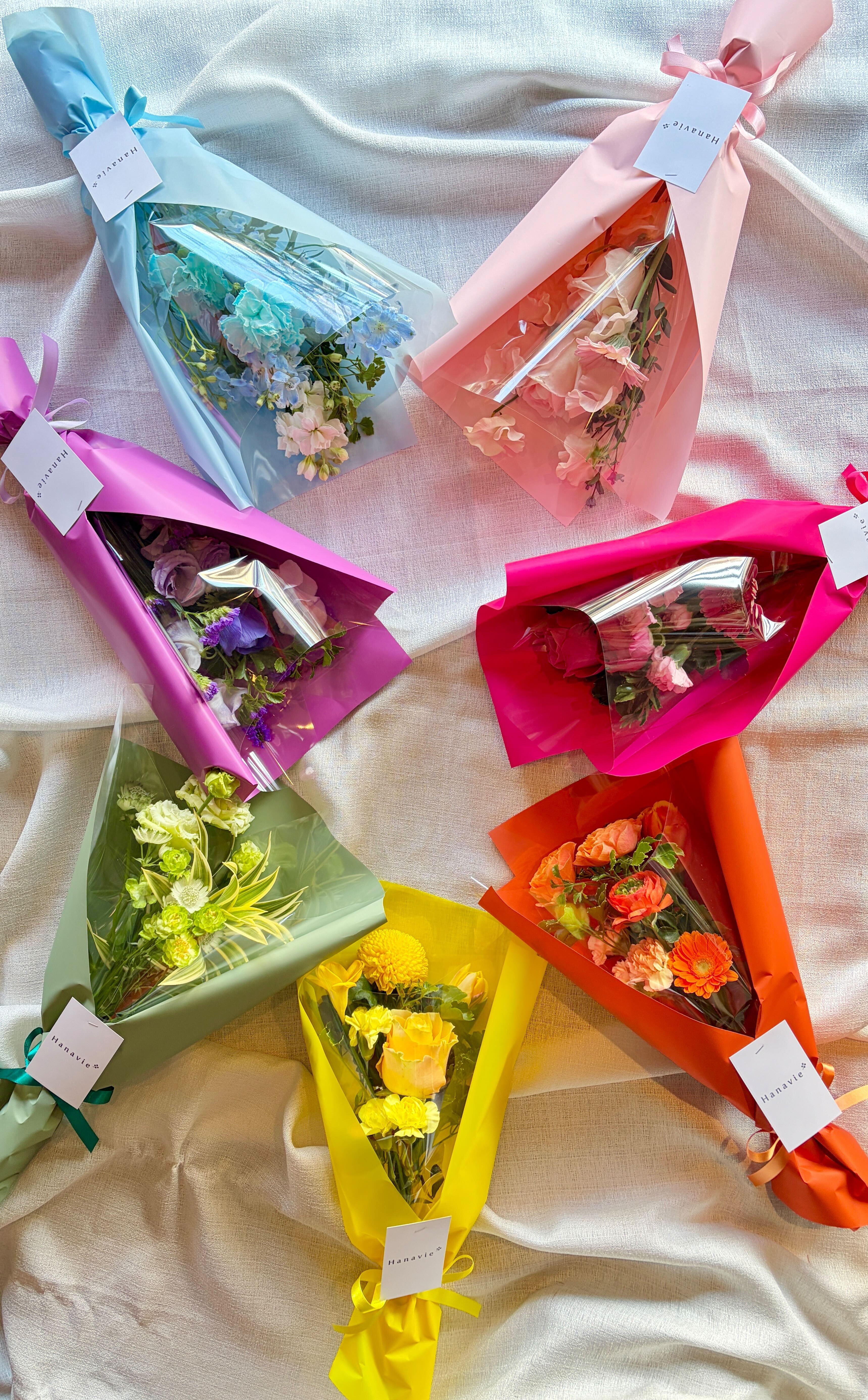 お好きな推し色のブーケを選んで、自分や大切な人に特別な気持ちを伝えましょう。お花のカラーはご希望の色に合わせてお作りしますので、個性や好みにぴったりのブーケになります。お花は季節ごとの旬なものを使用するので、どんなお花が入るかはお楽しみ!