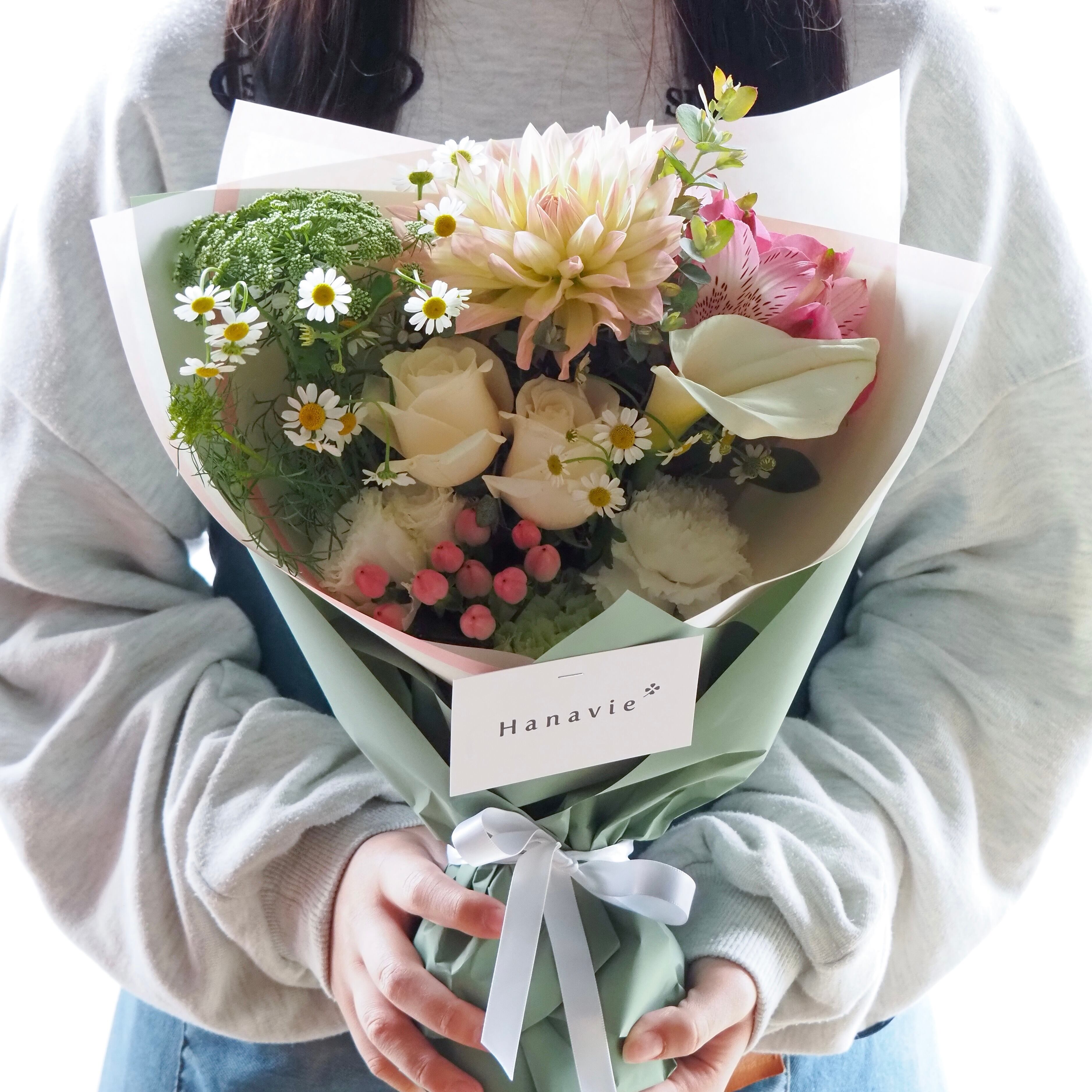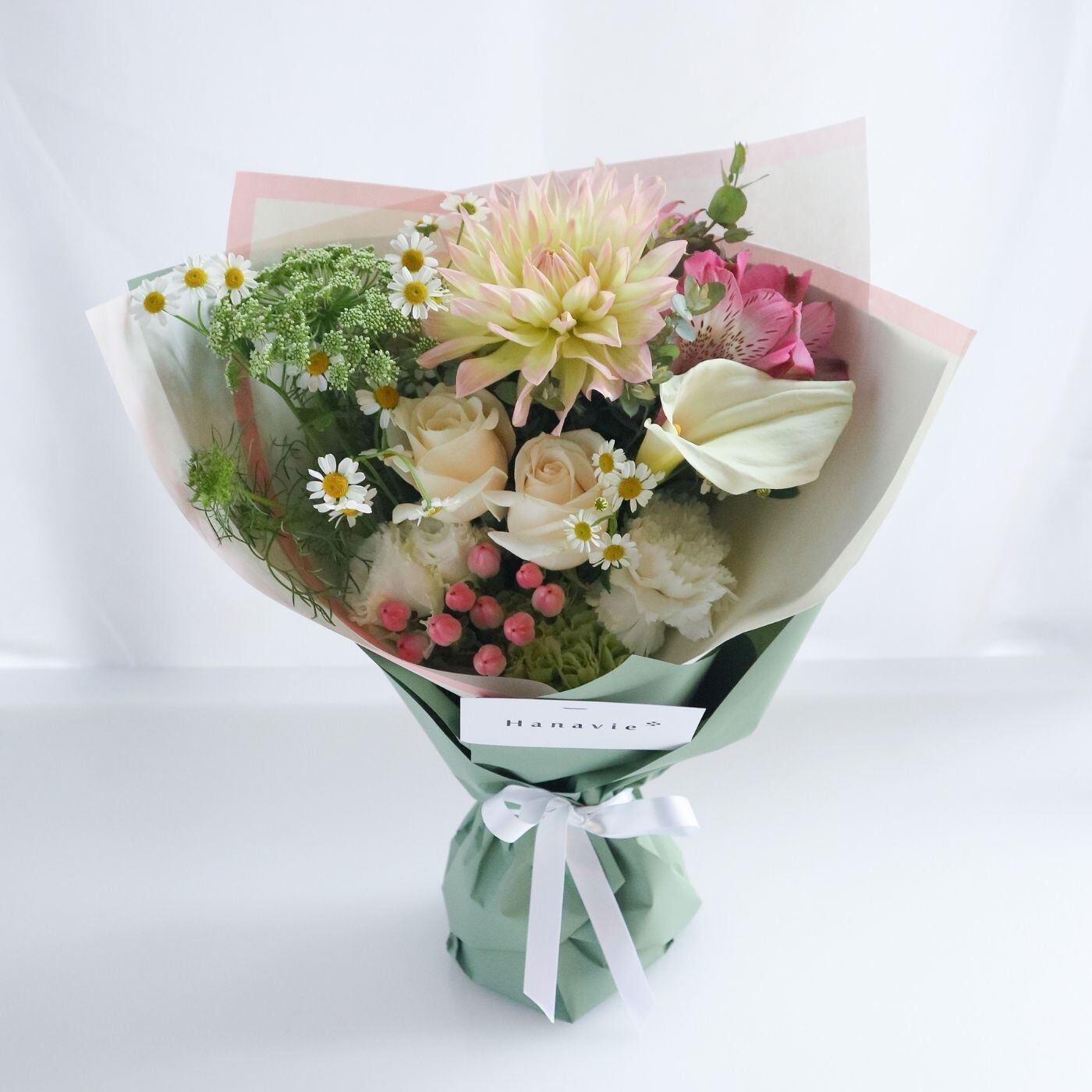 お花が好きな方はお好きな花瓶にいけかえることもできる自由度の高いブーケです。