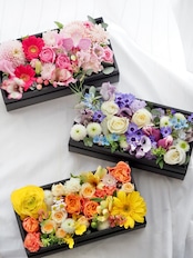 一見お花には見えないサプライズとしてもおすすめのボックスアレンジメント。もちもよく、箱を開けた瞬間にお花の香りが広がります。