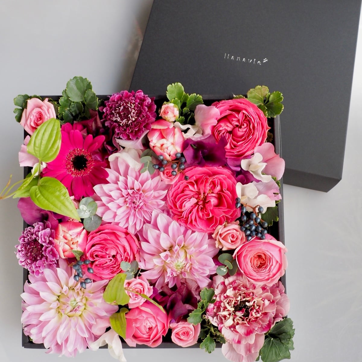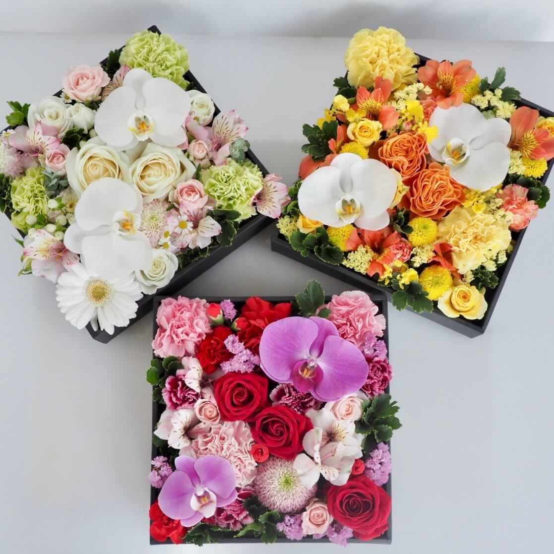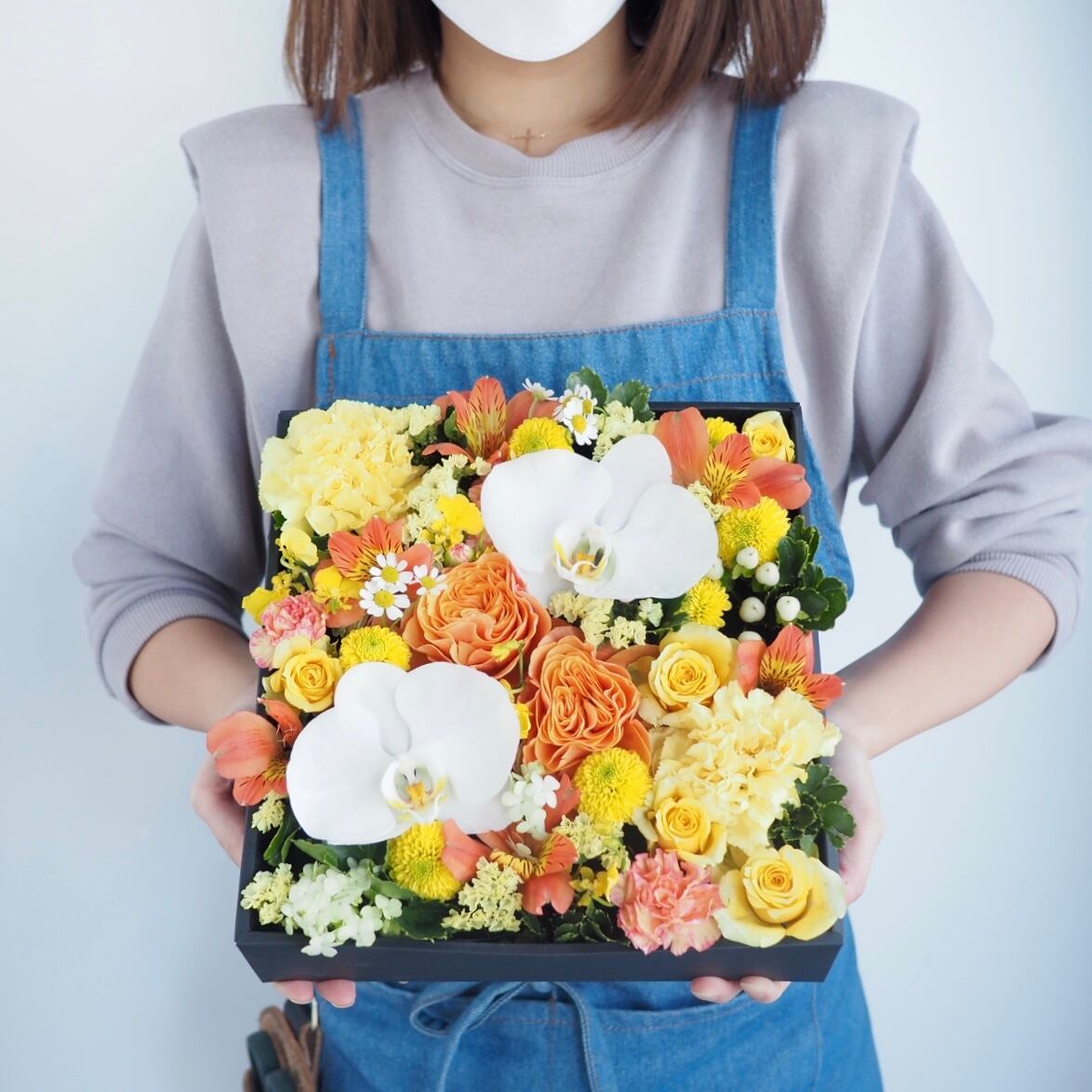 一見お花には見えないサプライズとしてもおすすめのボックスアレンジメント。もちもよく、箱を開けた瞬間にお花の香りが広がります。 箱からお花が溢れるようなオリジナルデザインです。ご希望のお色味を備考欄にご記入ください。 ふたに立てかけて飾れるようになっております。 お花の内容や色味はイメージです。画像と実際のお花の種類が異なる場合がございます。 ◆キュート:ピンク中心に可愛らしく ◆ゴージャス:赤やパープルで大人っぽく ◆ビタミン:黄色オレンジで明るく元気に ◆ソフト:白グリーンに少しお色味を入れて ◆リクエスト:ご希望のカラーイメージを備考欄にてお伝えください。お任せの場合もこちらを選択してください。お任せの場合には、性別や世代・ご用途などをご記載いただければ、おすすめのお花でお作りいたします。 ※リクエスト以外を選んだ方も、贈られる方のイメージやご希望がございましたら、備考欄にてお知らせください。 サイズ: □横25cm×縦約24.2㎝×高さ約10㎝(ボックス外寸) ※写真はイメージです。仕入れ状況により、使用花材が一部変更になる場合があります。 ※北海道、四国、一部中国地方、九州、沖縄、離島につきましてはお届けにお時間を頂きます。 稀にお花の品質に影響が出ることもございますのでご了承ください。