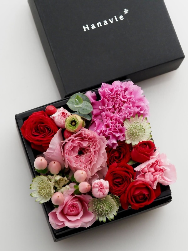 一見お花には見えないサプライズとしてもおすすめのボックスアレンジメント。もちもよく、箱を開けた瞬間にお花の香りが広がります。