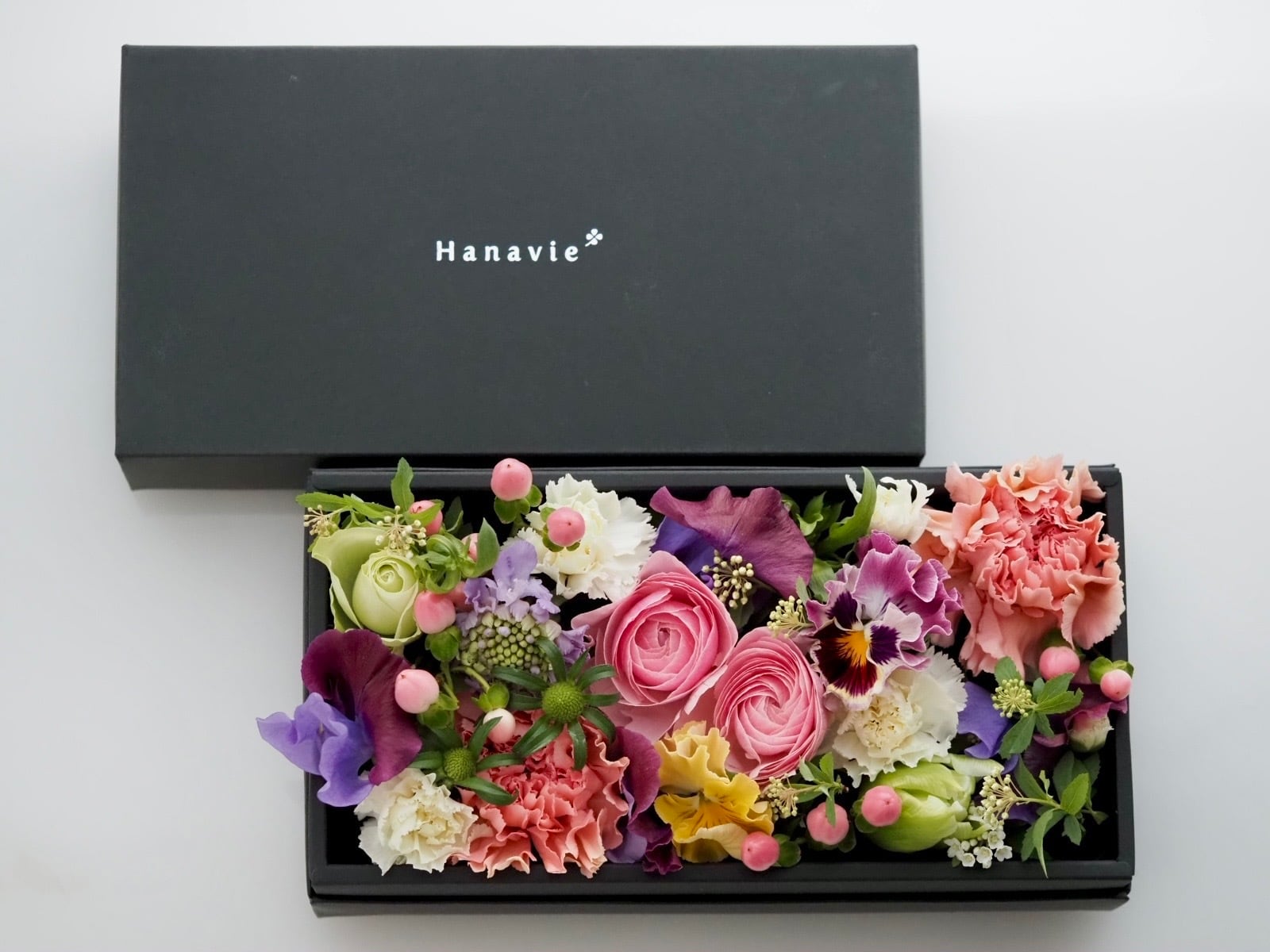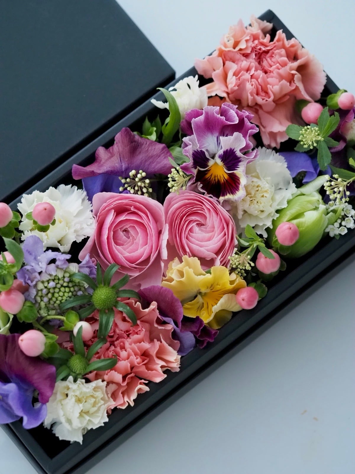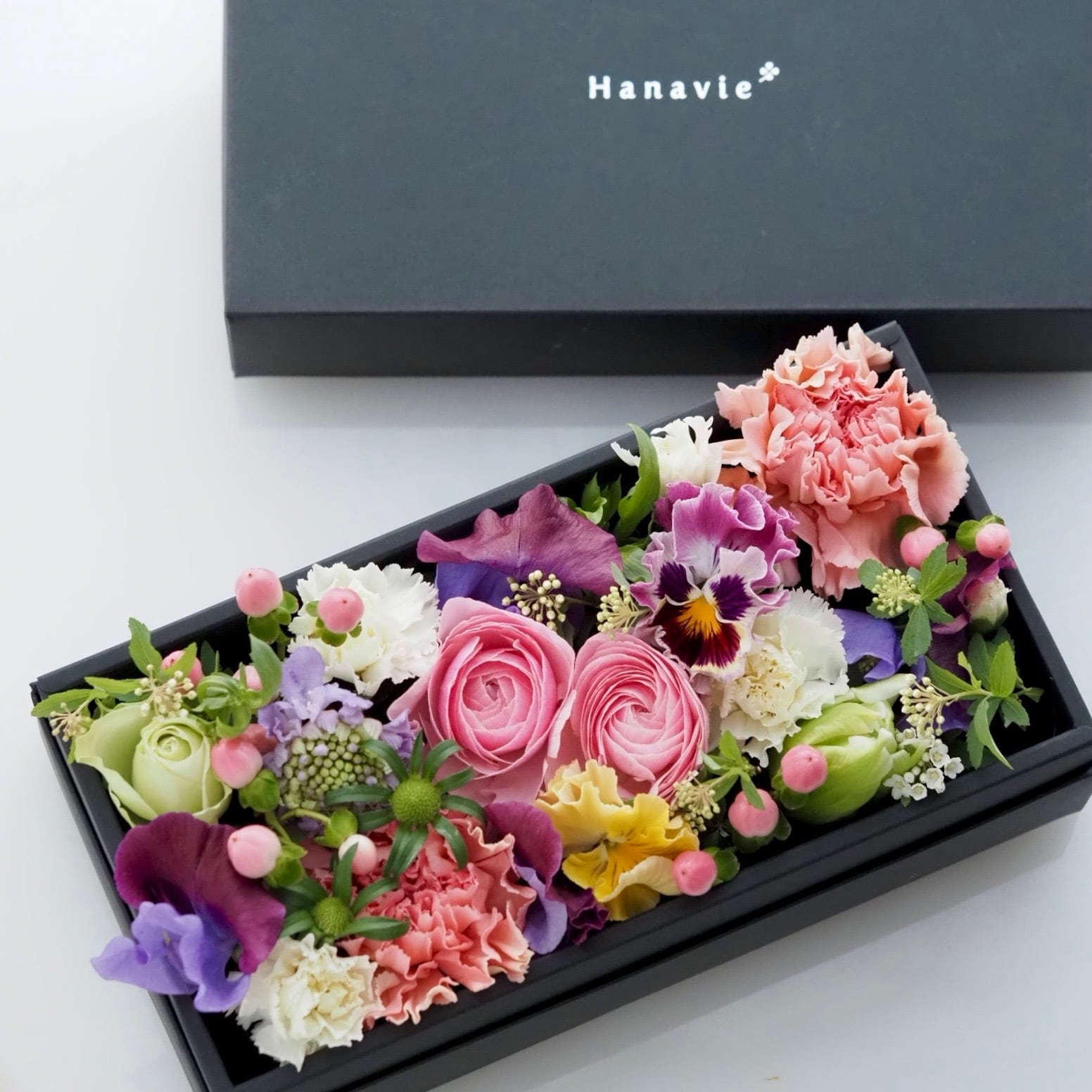 当店人気のボックスアレンジメントに、春の花がたっぷり詰まったスプリングバージョンが登場です。一見お花には見えないサプライズとしてもおすすめのボックスアレンジメントは、持ちもよく、箱を開けた瞬間にお花の香りが広がります。箱からお花が溢れるようなオリジナルデザインです。ふたに立てかけて飾れるようになっております。